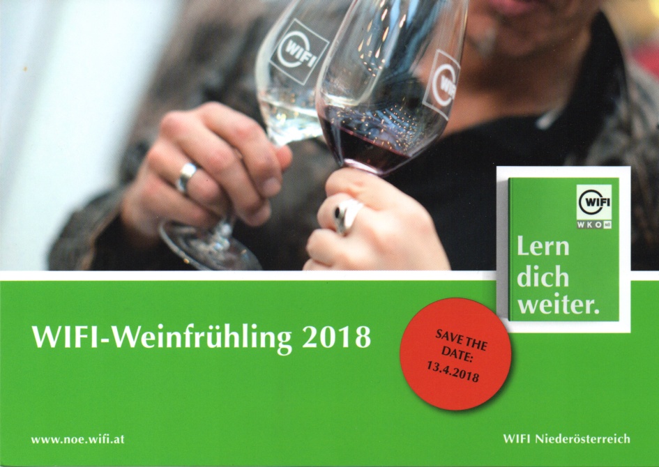19.3.2018: Der WIFI Weinfrühling 2018 findet heuer am 13.4.2018 im Wifi St. Pölten statt. Auch wir werden wieder mit einigen “kostbaren” Weinen vertreten sein. Bei dieser schon traditionellen Veranstaltung stehen eine Vielzahl verschiedener Weine von über 70 heimischen Winzern zur Verkostung bereit. Beginn ist um 16 Uhr, Eintritt 10 Euro /Person. Vielleicht sehen wir einander zu diesem Anlass...