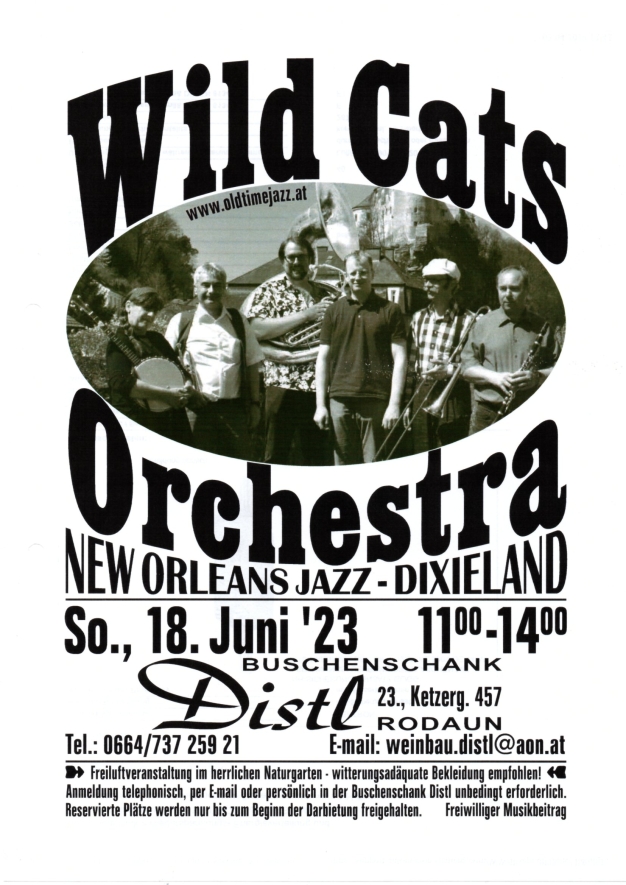 13.5.2023: Am Sonntag, den 18. Juni 2023 um 10:30 Uhr findet wieder der traditionelle Jazzfrühschoppen mit den "Wild Cats" statt. Die Darbietung findet jedenfalls im Freien statt. Eine zeitgerechte Reservierung ist unbedingt erforderlich. Wir freuen uns darauf viele Ohrwürmer präsentiert zu bekommen.